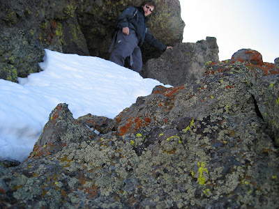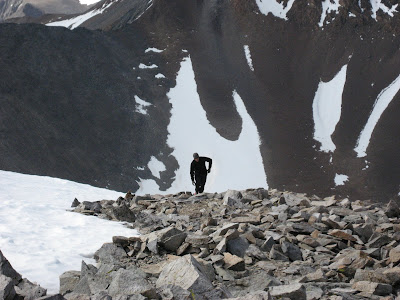 Once on the ridge, I encountered some exposed mixed climbing on the face of the false summit. From the top of the false summit, I traversed west across the ridge-top towards the summit. The final 50 vertical feet up the summit block consisted of an exposed traverse across a neve slab just under the rock face with large cliff drops below. A fall from this point would likely end at the bottom of the mountain. From this point, 20 more vertical feet of rock and mixed climbing yielded the summit.
