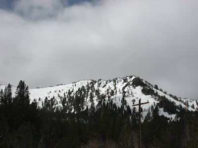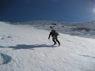 After a long night of partying till 3am, I awoke at 6am to get down to business. I drove over to Carson Pass, geared up, and left the car at 10am. I snowshoed approximately 4 miles to the base of Round Top with relative ease and felt good. I headed over to the base of the north face (east side) and cached my snowshoes and trekking poles at the base. Here I switched to crampons and an ice axe.