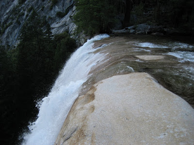 I descended approximately 200 feet of steep but stable neve, where I encountered a rock and ice wall 6 feet high. Under this chute was another steep and narrow neve slope pointing straight down the face. I carefully descended the rock and continued down the neve slope. As I continued lower, I could see that the neve couloir ended with larger rock cliff below followed by a vertical drop of over 300 feet.